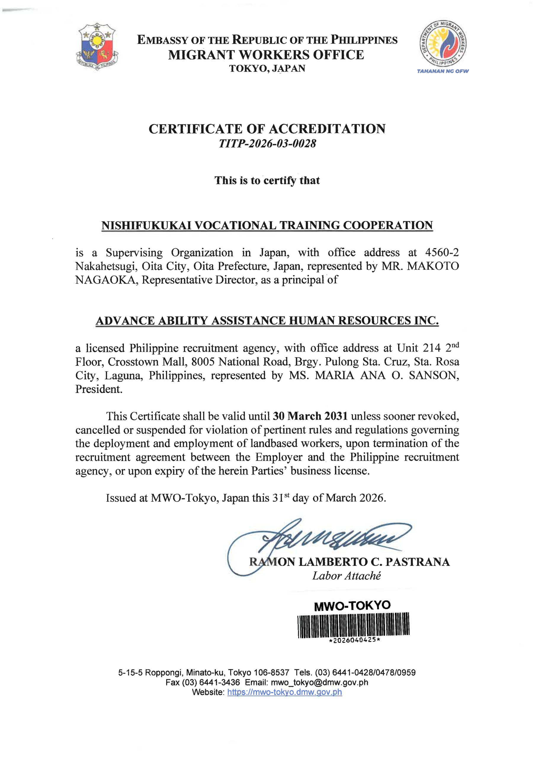 2026.04.6 フィリピンの労働者受入団体として西服会が「認定」を受けました フィリピン大使館に申請していた労働者受入団体の認定証が届き、フィリピン人実習生の受入が可能になりました。 Post Share Hatena Pocket RSS feedly Pin it 訃報のお知らせ前の記事